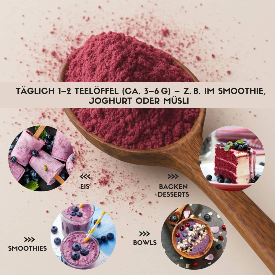 Anwendungstipp: Einfach 1–2 Teelöffel täglich in Smoothies, Joghurt, Porridge oder Bowls einrühren – für eine fruchtige und natürliche Verfeinerung.
