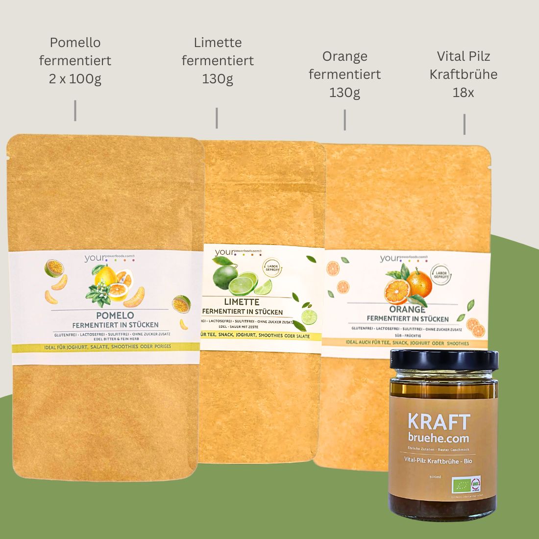Fermentierte Früchte (Pomelo, Orange, Limette): Durch die Fermentation bleiben wichtige Ballaststoffe und Vitamine erhalten – insbesondere Vitamin C, das zu einer normalen Funktion des Immunsystems beiträgt und die Zellen vor oxidativem Stress schützt.