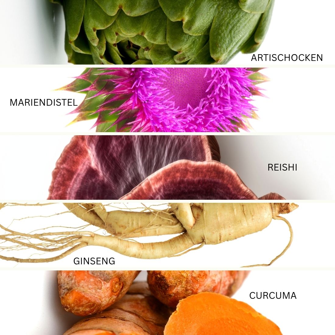Artischocken Extrakt, Mariendistel Extrakt, Steviolglycoside, Reishi – Pilz Extrakt, Ginseng Extrakt, Curcuma.