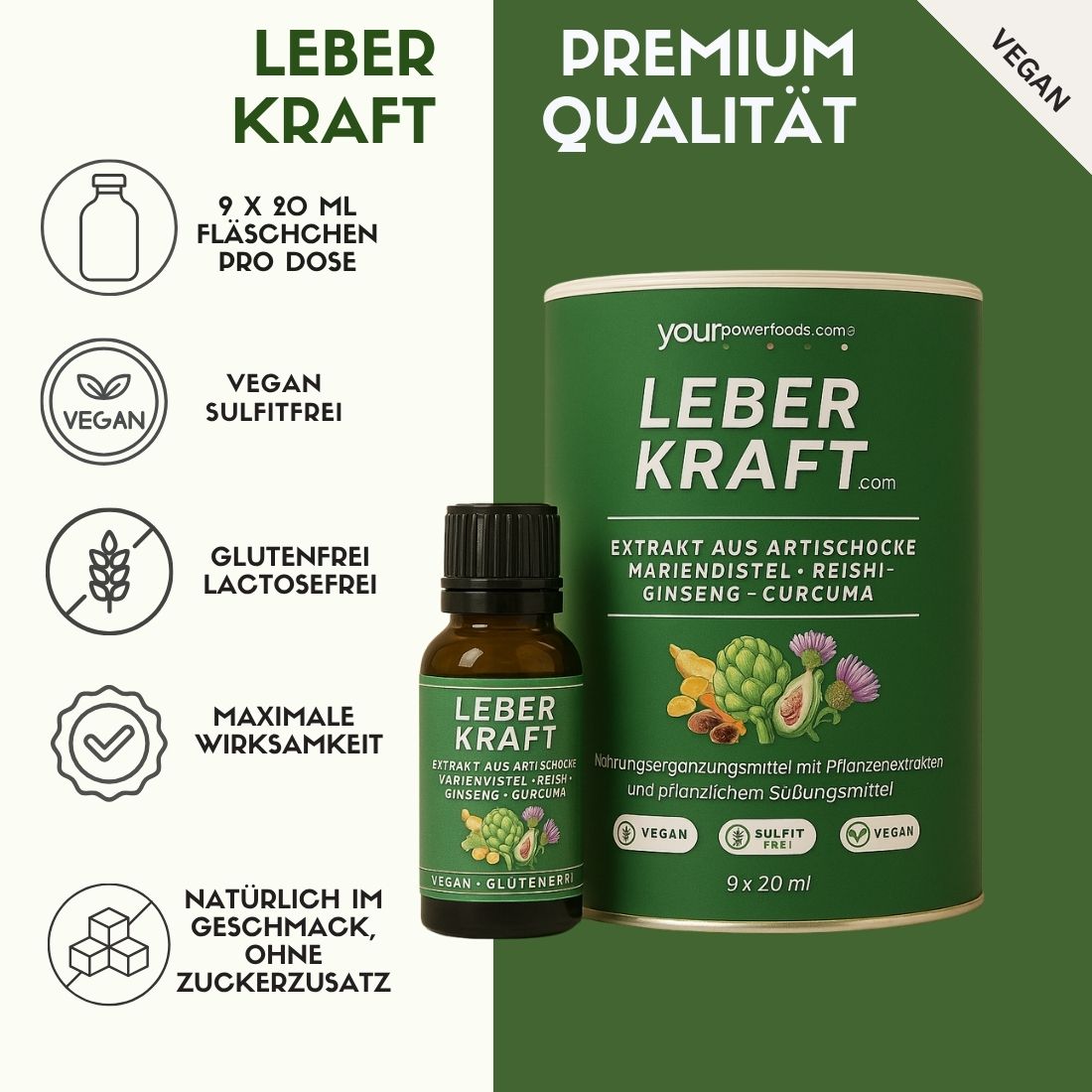 Leberkraft ist keine gewöhnliche Nahrungsergänzung – es ist ein durchdachtes System für deinen metabolischen Neustart. Die 18 trinkfertigen Fläschchen enthalten genau das, was deine überarbeitete Leber jetzt braucht: eine kraftvolle Kombination aus Artischocke, Mariendistel, Reishi, Ginseng und Curcuma – ohne künstliche Zusätze.