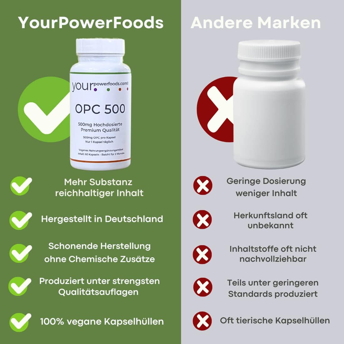Jede Kapsel liefert 500 mg OPC und ist frei von künstlichen Zusatzstoffen.